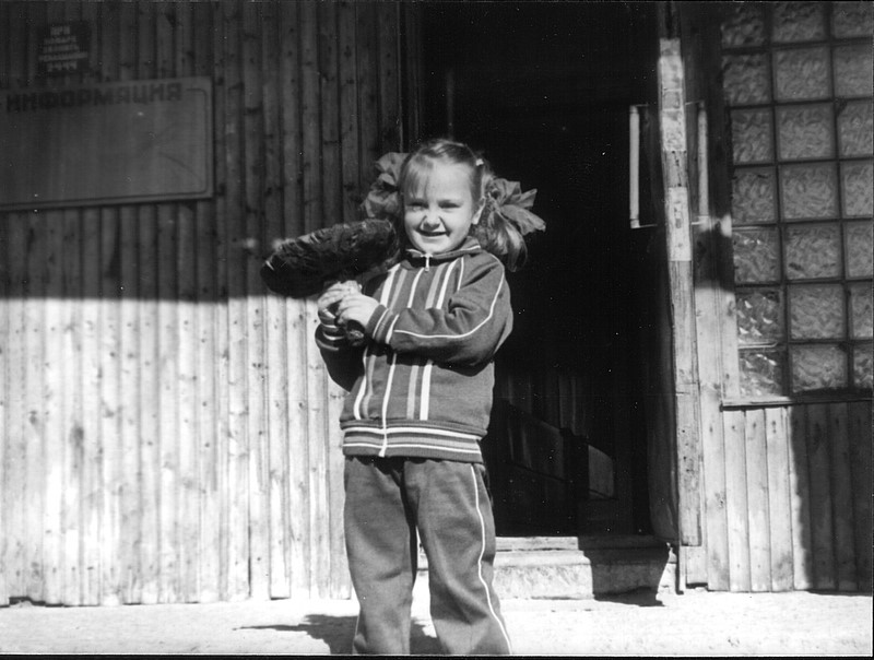 А второй снимок — это уже конец лета или начало осени 1987 года — это Маша Голощапова, дочка нашей библиотекарши Азы Александровны Голощаповой, стоит с огромным грибом на ступеньках около входа в штаб части. Таких грибов, как на Севере, я больше нигде не видел.