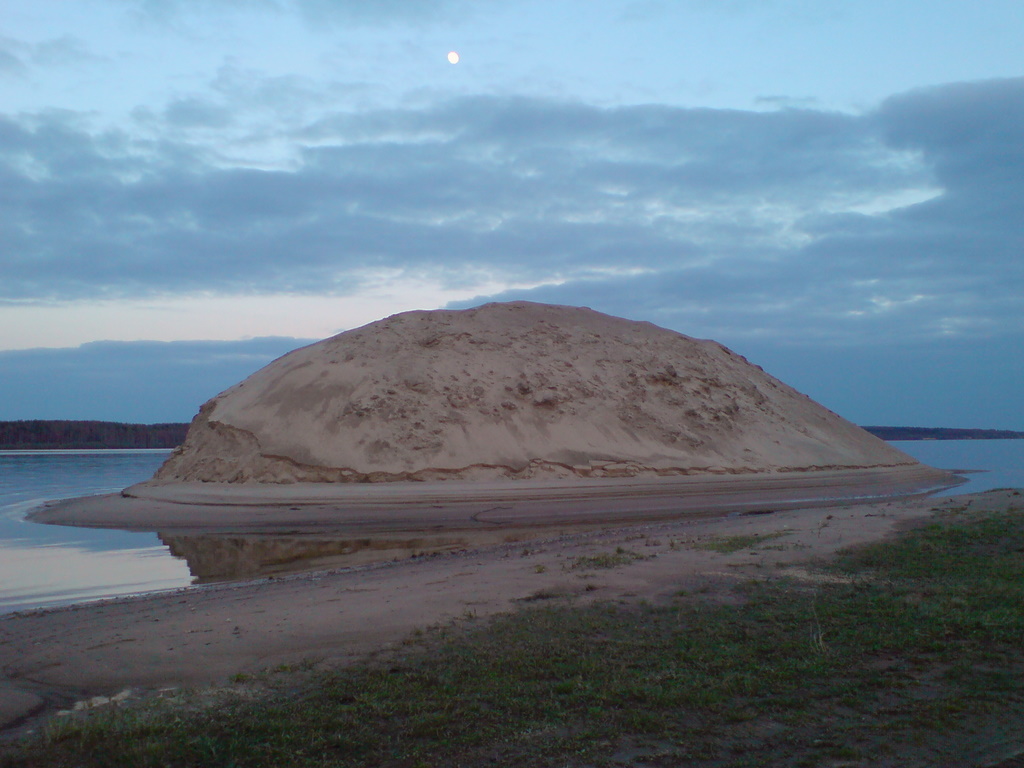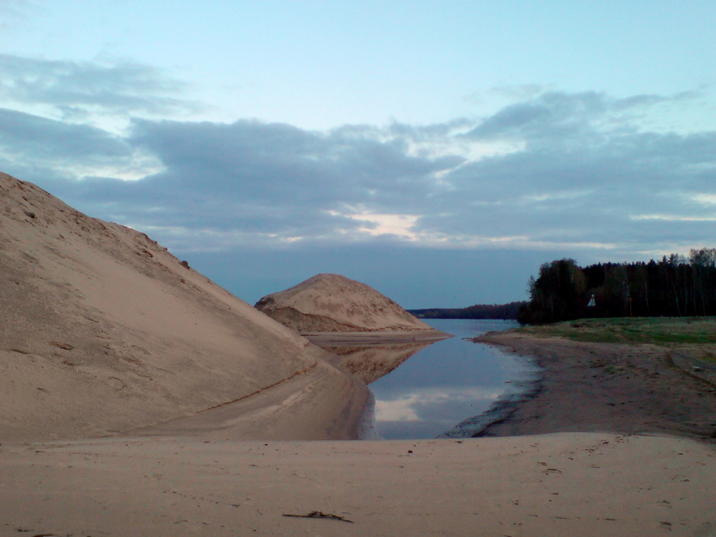 Обратите внимание на первый кадр — прямо рядом с волжским берегом приземлилась настоящая летающая тарелка, целиком сделанная из песка, она же чуть поодаль и на втором кадре. Сосна на третьем снимке несёт полезную нагрузку — растёт на обрывистом берегу ручья Гремец недалеко от нашего дома и задерживает, как может, процесс сползания берега вниз. На четвертом и пятом снимках силуэты моих старых знакомых лип и берёзы на фоне вечернего весеннего неба.