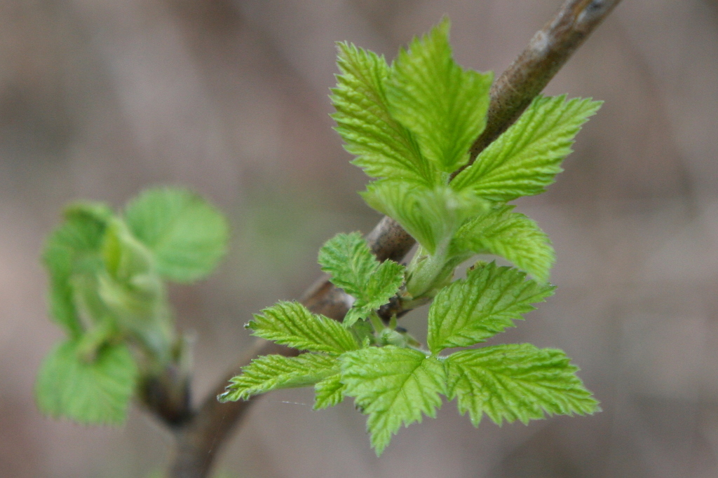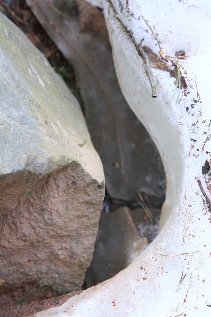 Немного о запечатлённом: на первом снимке последний снег (и спрятавшийся под ним лёд) в лесу, рядом с камнем, который когда-то был принесён в эти края ледником, далее первые листки малины (летом проверю вкус ягод на соседних кустах), затем распускающиеся молодые побеги на кусте черёмухи, ну и на последнем снимке заслуживает особого внимание тень на воде — просто горгулья или химера какая-то получилась, особенно это заметно на увеличенном снимке...