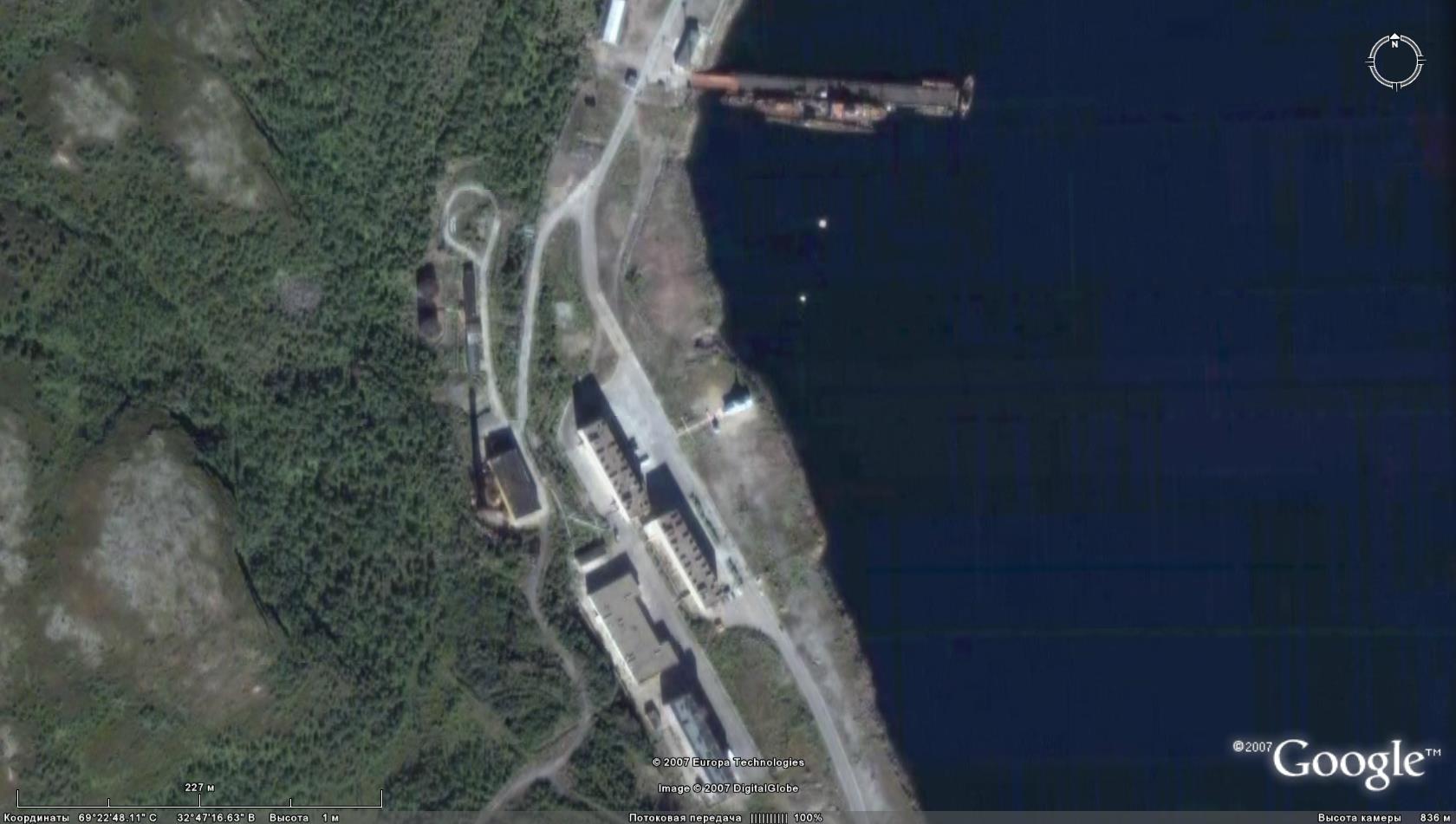 В центре спутникового снимка видна часовня, построенная рядом со штабом базы, откуда «Курск» вышел в последний поход.