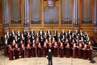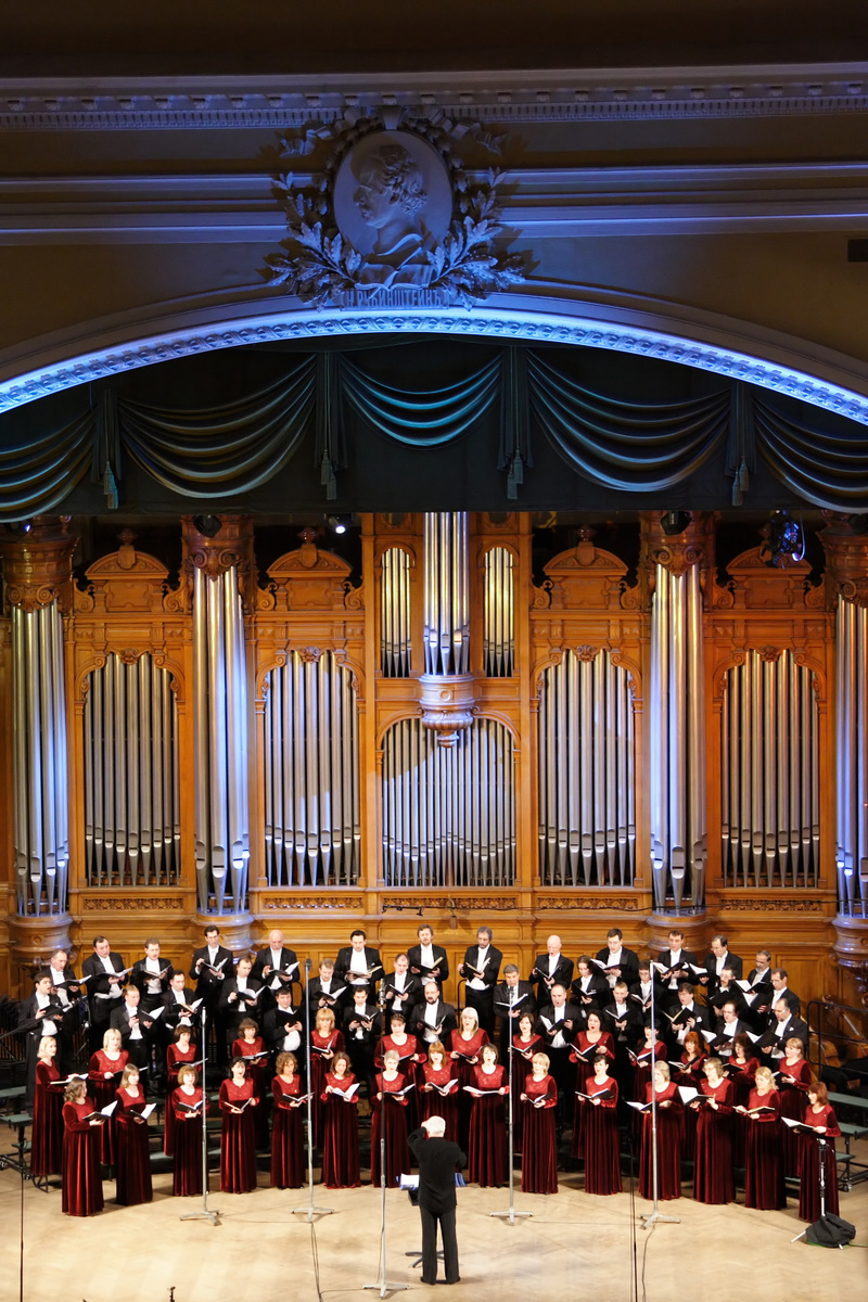 Большой зал консерватории, фрагменты из рахманиновских литургии Иоанна Златоуста и «Всенощного бдения» исполняет Государственная академическая симфоническая капелла России.