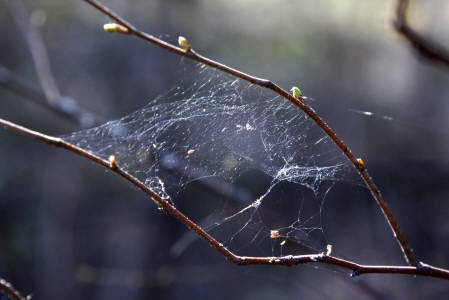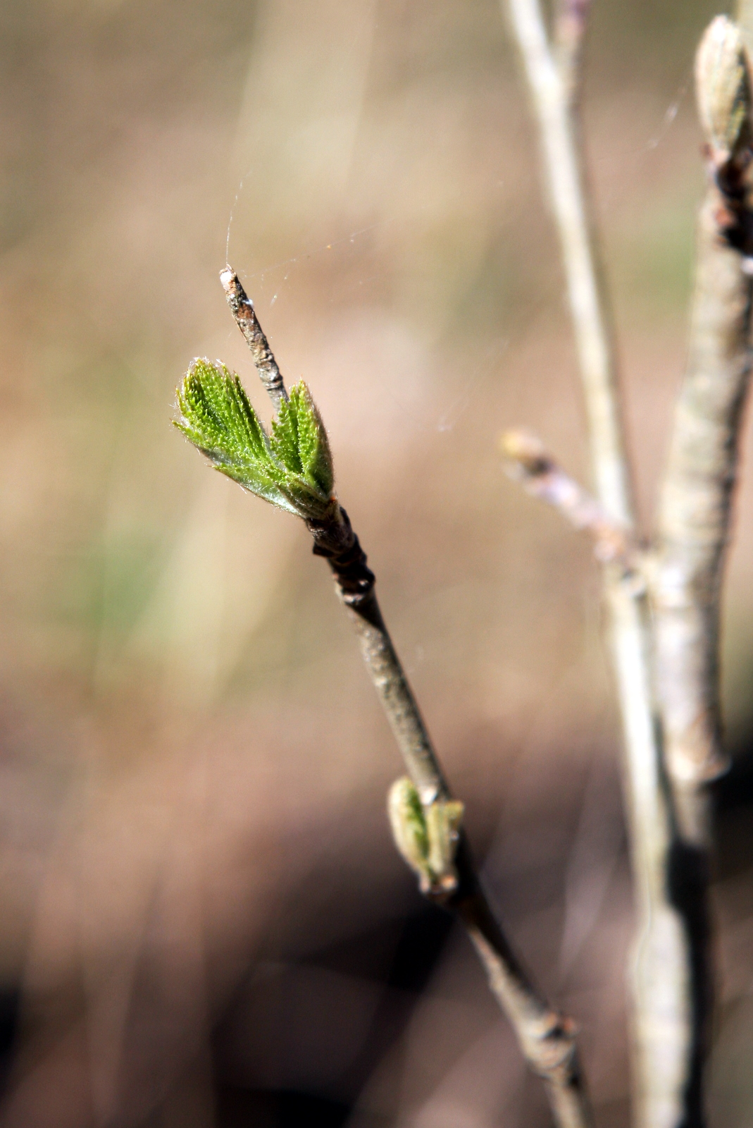 Особенно контрастно смотрится первая зелень в сравнении с бурыми ветками и серыми паутинками...