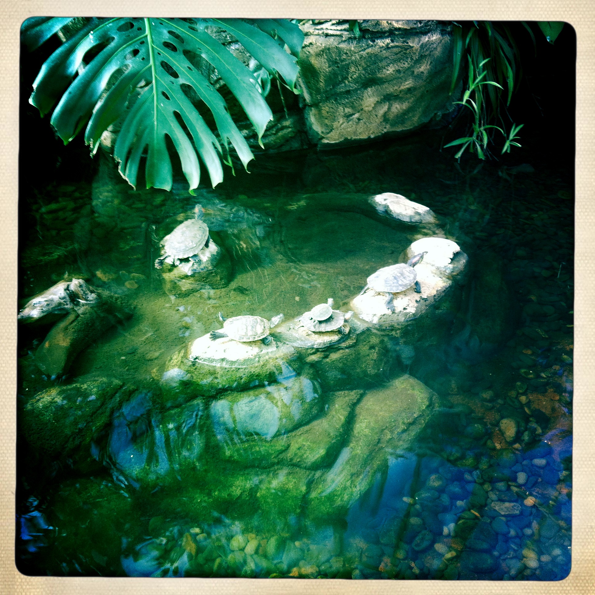 Пару недель тому назад зашёл как-то днём в торговый центр «Рио», что в Москве на Большой Черемушкинской улице. На третьем этаже увидел замечательный небольшой бассейн, в центре которого было что-то вроде пальмовых зарослей. Подойдя поближе и заглянув в этот бассейн, увидел замечательных рыб и черепашек, которыми и хочу поделиться здесь: