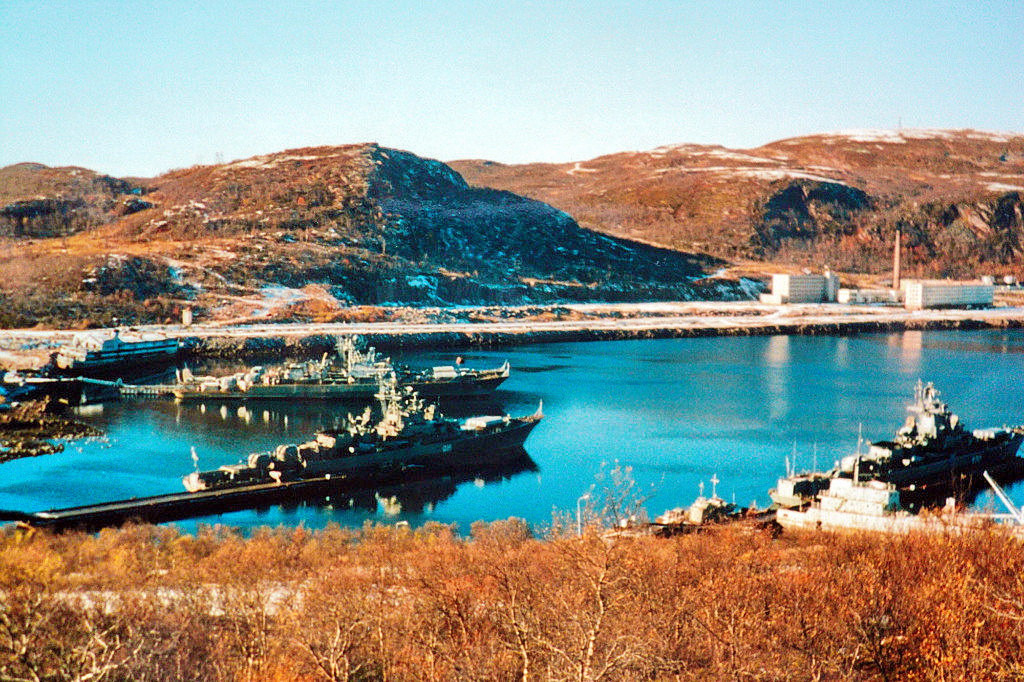 На снимке: Ара-Губа, 1990-е годы, расположение 130 бригады противолодочных кораблей, в правом углу снимка на том берегу здания в расположении 7 дивизии подводных лодок.